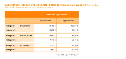 Ackerbauschule mit Vollpension - Preise f. gemeinnützige Gruppen