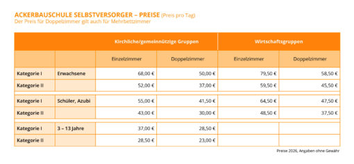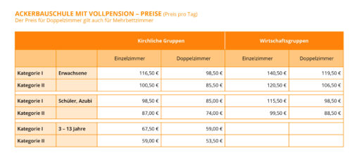 Ackerbauschule mit Vollpension - Preise f. kirchliche Gruppen/Wirtschaftsgruppen