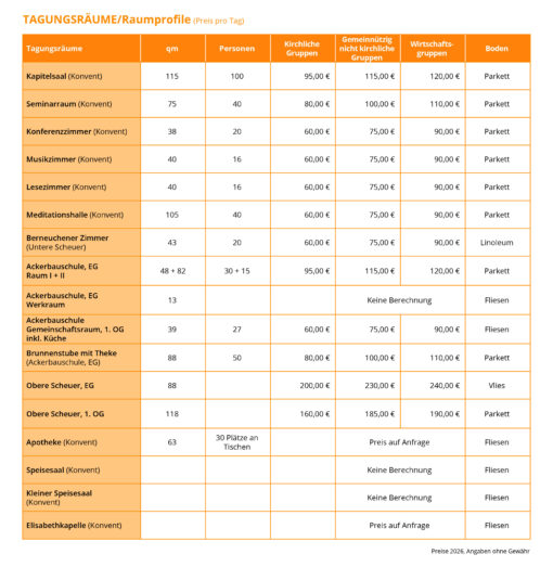 Die Preise für Tagesgruppen (ohne Übernachtung) erhalten Sie bei unseren Mitarbeiterinnen der Belegung (Telefon: +49(0)7454/883-100 / -129, belegung@klosterkirchberg.de)